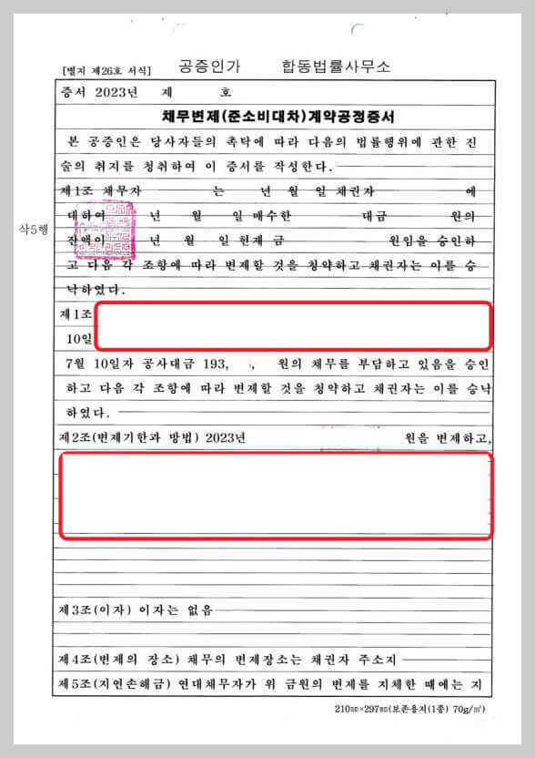 집행권원이 되는 공정증서를 작성하려면 반드시 채무자 본인이 공증 절차에 참여해야 하며, ‘강제집행에 관한 인낙’ 조항이 있어야 합니다. 예를 들어, 다음과 같은 문구가 포함되어야 합니다.