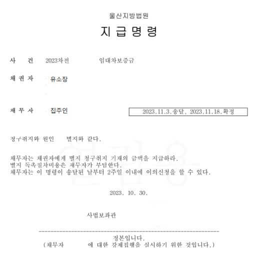 채무자가 정해진 기간 내에 이의제기를 하지 않으면, 지급명령은 확정되고 집행권원이 됩니다. 이렇게 되면 채권자는 해당 문서를 근거로 법원에 강제집행을 신청할 수 있습니다.