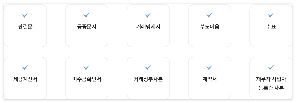 아래 서류 외 채권을 증빙할 수 있는 서류, 채무자인적사항(성명, 생년월일, 주소, 전화번호 등)은 필수입니다.